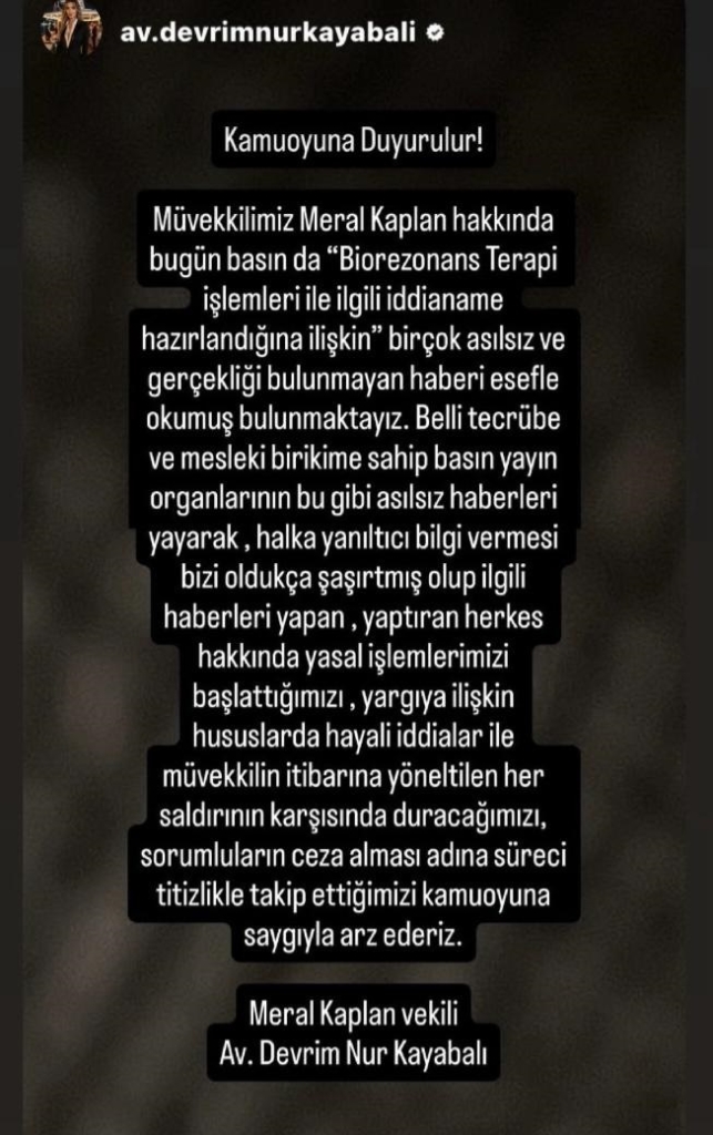 Müvekkilimiz Meral Kaplan hakkında bugün basında yer alan “Biorezonans Terapi işlemleri ile ilgili iddianame hazırlandığına ilişkin” birçok asılsız ve gerçekliği bulunmayan haberi esefle okumuş bulunmaktayız. Belli tecrübe ve mesleki birikime sahip basın yayın organlarının bu gibi asılsız haberleri yayarak, halka yanıltıcı bilgi vermesi bizi oldukça şaşırtmış olup, ilgili haberleri yapan ve yaptıran herkes hakkında yasal işlemlerimizi başlattığımızı, yargıya ilişkin hususlarda hayali iddialar ile müvekkilin itibarına yöneltilen her saldırının karşısında duracağımızı, sorumluların ceza alması adına süreci titizlikle takip ettiğimizi kamuoyuna saygıyla arz ederiz.